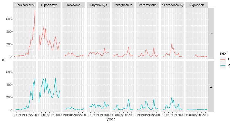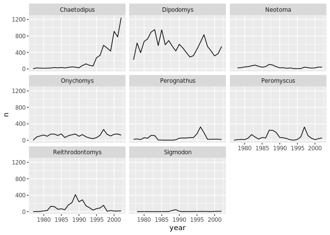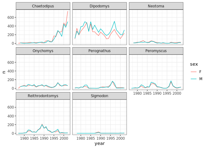 yearly_weight <- surveys_complete %>% group_by(year, species_id) %>% summarize(avg_weight = mean(weight)) ggplot(data = yearly_weight, mapping = aes(x=year, y=avg_weight))+ geom_line() + facet_wrap(vars(species_id)) + theme_bw()