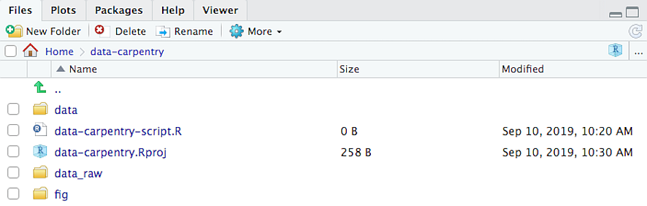 Filestab on the right of the screen, click onNew Folderand create a folder nameddata_rawwithin your newly created working directory (e.g.,~/data-carpentry/). (Alternatively, typedir.create("data_raw")at your R console.) Repeat these operations to create adataand afigfolder.